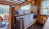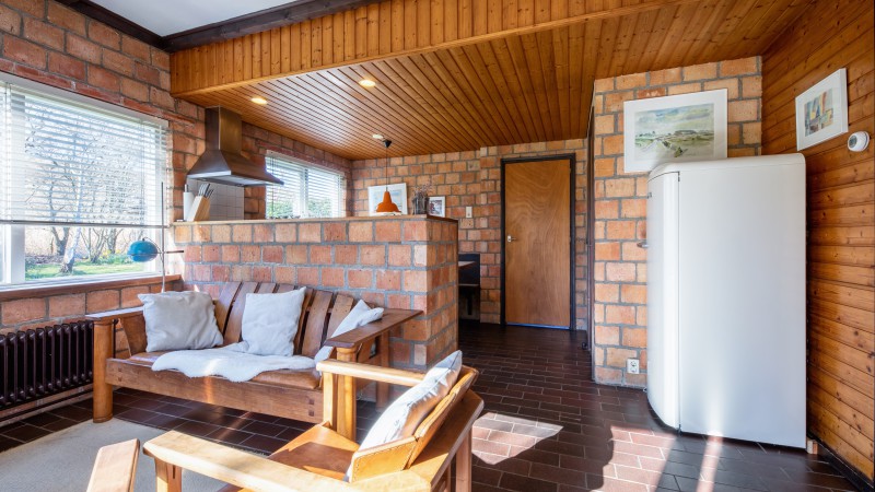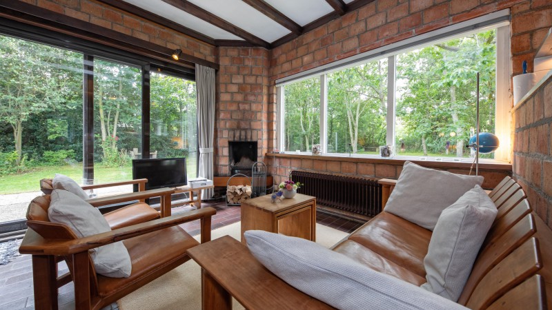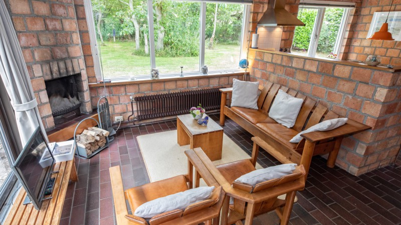 Wohnzimmer mit Sitzmöbel und Eßtisch und Kamin, Brennholzsäcke sind an der Rezeption erhältlich.