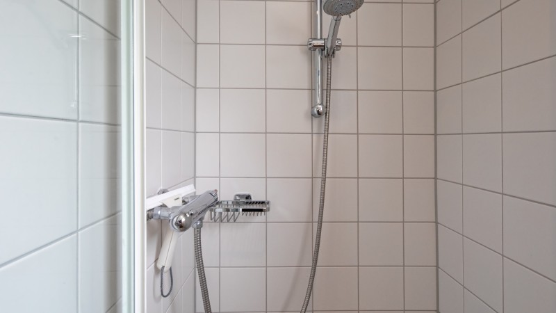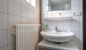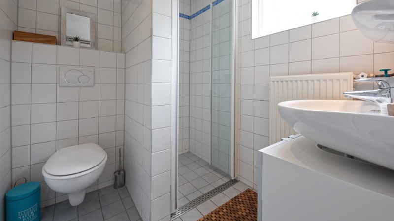 Badezimmer mit Dusche, Waschbecken und Toilette