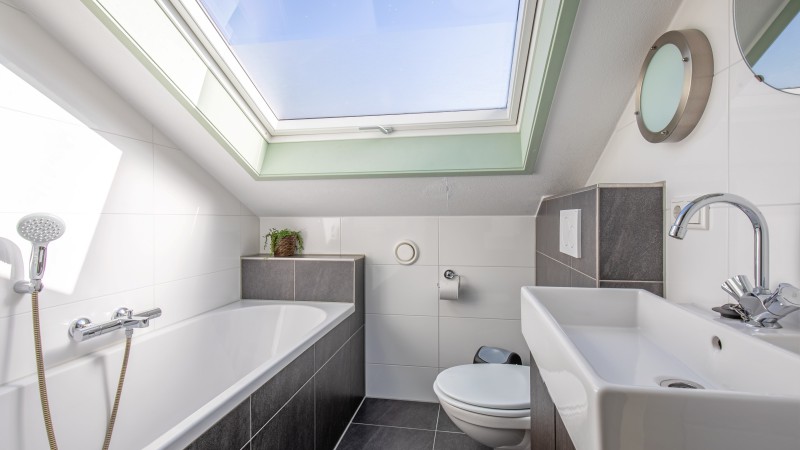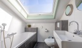 im ersten Stock ein Badezimmer mit Badewanne, Waschbecken und Toilette