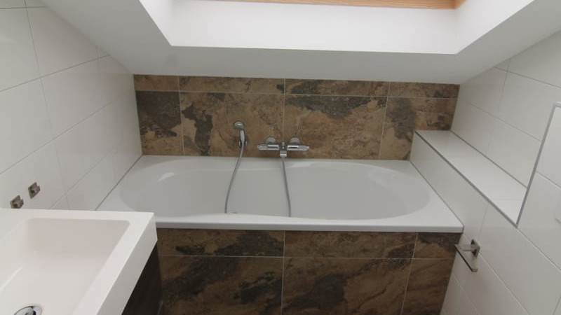 Zweites Badezimmer mit Badewanne mit Dusche, Waschbecken und Toilette (erster Stock)