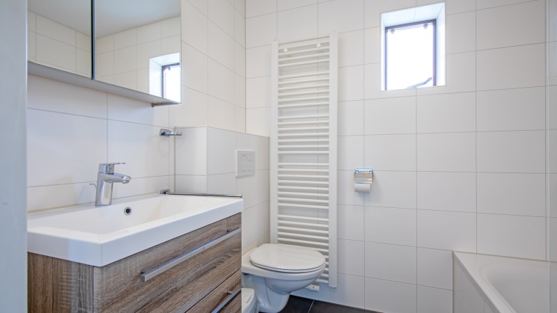 Op de begane grond een badkamer met bad, toilet en wastafel