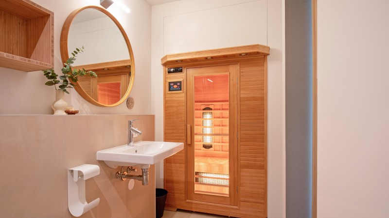 In deze slaapkamer op de begane grond vindt u tevens een badkamer met douche, toilet en een infra-rood-sauna. Heerlijk om tijdens uw vakantie gebruik van te maken!