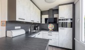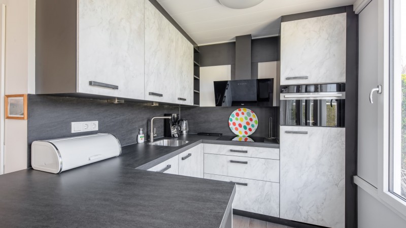 Küche mit Kaffeemaschine, Wasserkocher, Toaster, Sandwichtoaster, Mixer, Entsafter,