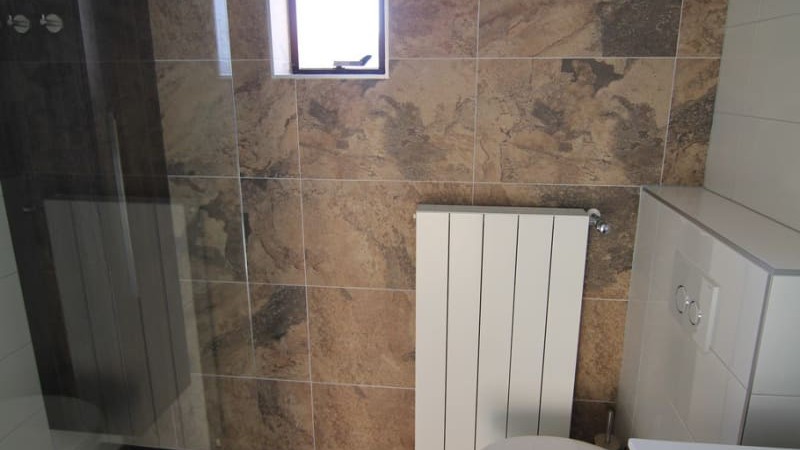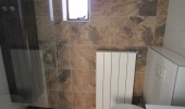 Badezimmer mit Dusche, Waschbecken und Toilette (Erdgeschoss)