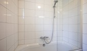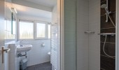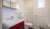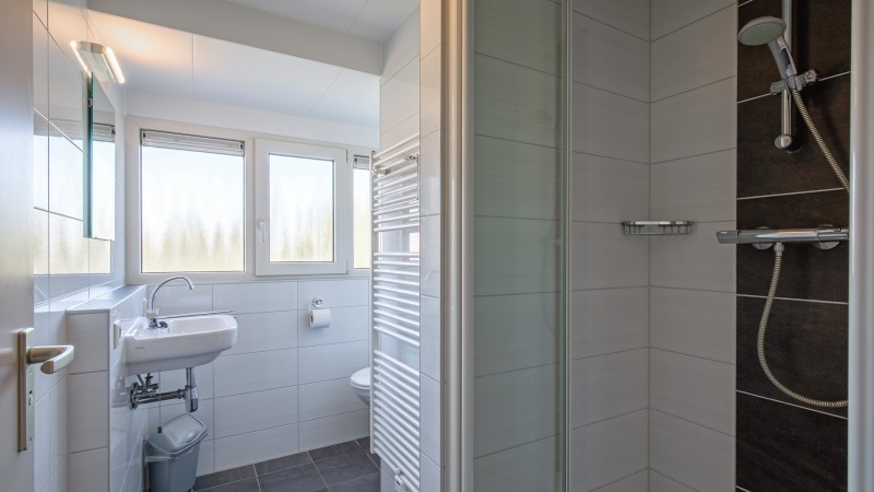 Im ersten Stock ein Badezimmer mit Dusche, Toilette und Waschbecken