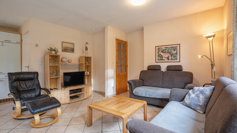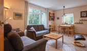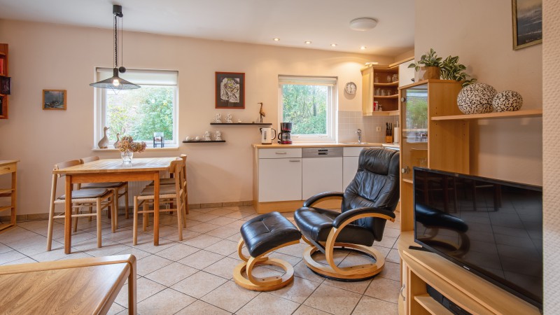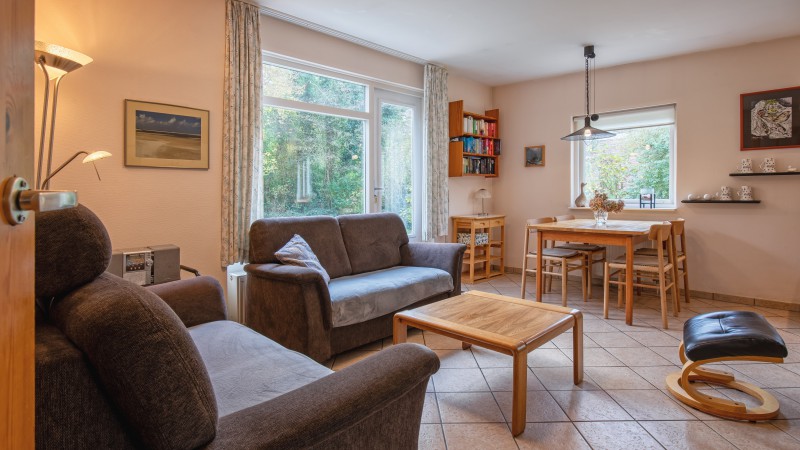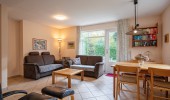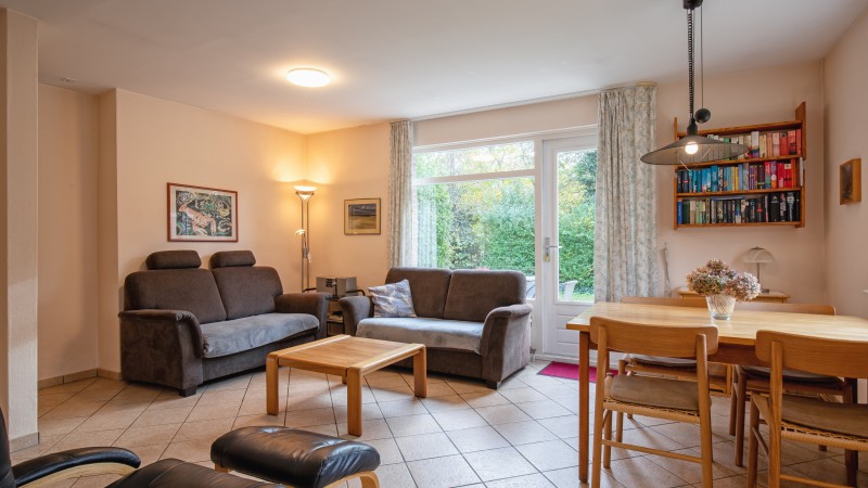 Komfortabler Bungalow mit gemütlichem Wohnzimmer mit Sitzecke und Esstisch.