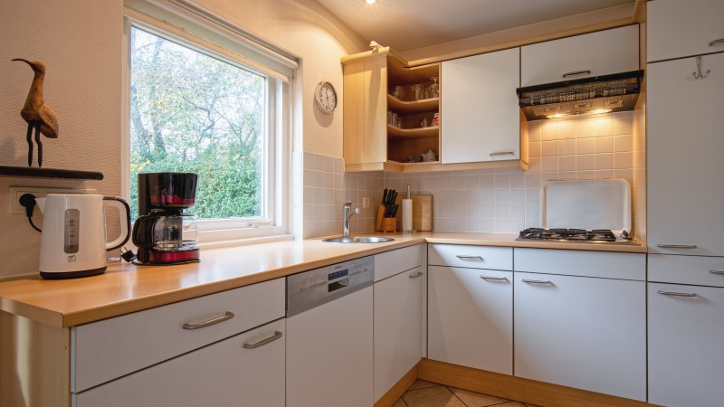 Die offene Küche verfügt über eine Filterkaffeemaschine, einen Wasserkocher, einen Geschirrspüler und einen Kühlschrank.