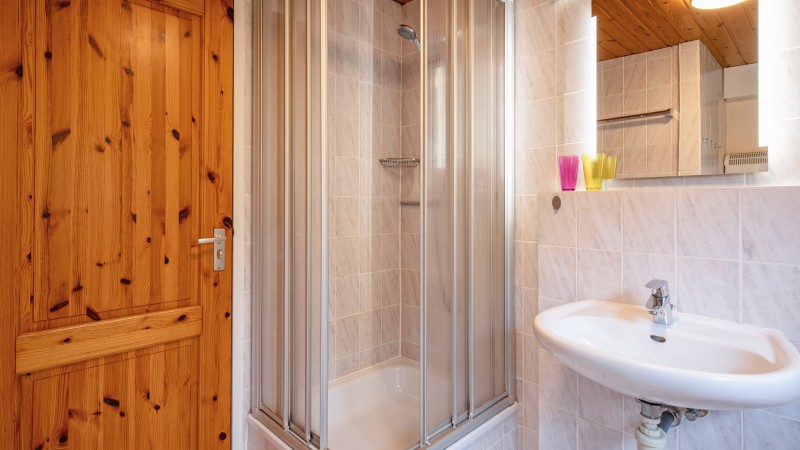 Geräumiges Badezimmer mit Dusche, Waschbecken und Toilette.