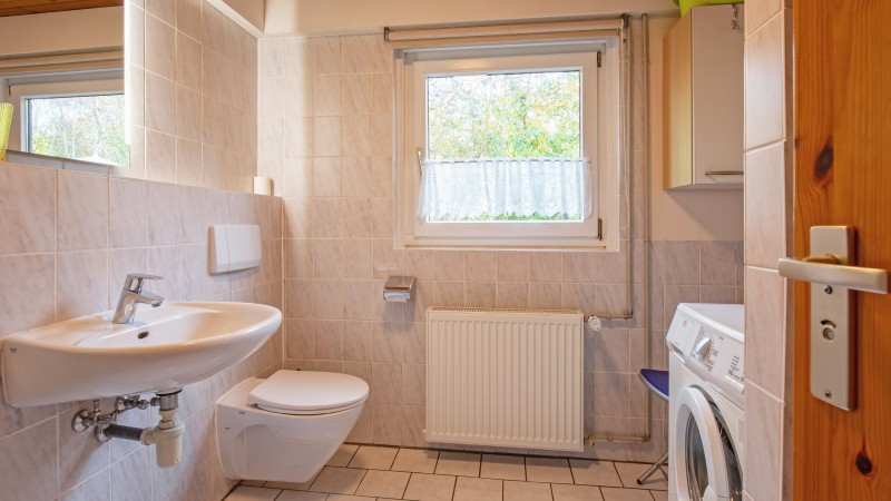 Im Badezimmer befindet sich auch eine Waschmaschine.